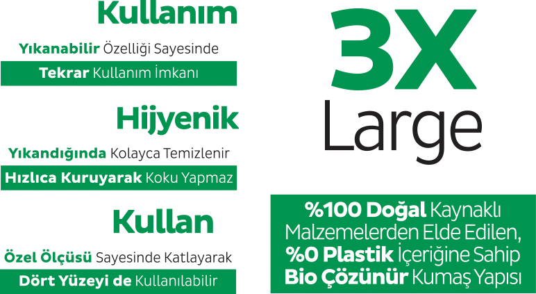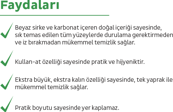 İz bırakmayan doğal içerikli formülü sayesinde cam yüzeylerde, masa, tezgah yüzeylerinde, wc, lavabo, banyo temizliğinde, halı, elektronik eşya temizliğinde, hastane, laboratuvar, güzellik merkezleri, spor salonları, eğitim kurumları, ev ve iş yerlerinde hijyene önem veren durulama gerektirmeyen pratik, hijyenik, kullan-atyüzey temizlik havlusu.